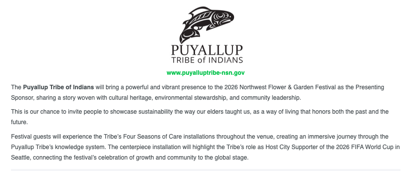 In just 19 days, the Northwest Flower and Garden Festival begins. In its 37th year, I’m delighted to have enjoyed so many of these annual events with family and friends. (To read a bit about its inception and history click here.) This year is an historic one though, with the Puyallup Tribe of Indians being a sponsor for the show. Here’s what they had to say about it on the site.